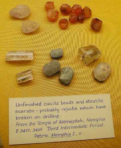 Stone borers and drills were also used by the ancient Egyptians. Lucas and Harris (1962) gives examples of drilling with copper or stone points, where the drill holes are still clearly visible. For example: a) Marks on two pieces of inscribed stone vases of diorite and dolomitic limestone, from the Step Pyramid at Saqqara (3rd Dynasty) b) Marks on a diorite bowl of Khaba (3rd Dynasty) c) The nostrils, ears and corners of the mouth of an alabaster statue of Menkaure (4th Dynasty). Many stone beads have been found with holes drilled for threading. Figure 16 presents a number of unfinished beads that contain holes from the Temple of Memeptah. Small flint drill-bits and borers, used in the manufacturing of beads, can be found at The Petrie Museum (UC14877).