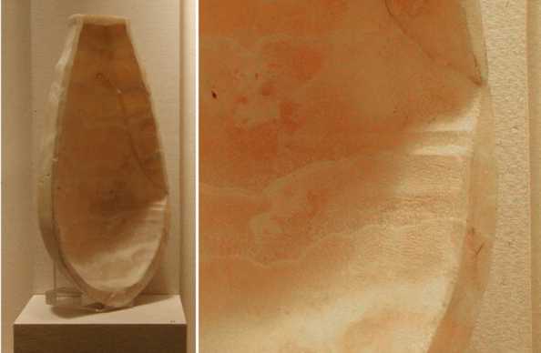 A limestone block with 10 boring sockets with circular striations and ridges (somewhat similar in appearance to those in a center cup of a 3rd Dynasty travertine ornamental dish from Saqqara: image) from the mastaba of Perneb at Saqqara (Arnold 1991). The holes are randomly distributed over the top of the block's surface with some slightly overlapping at the edges. Objects such as these may represent an underlying block used to bore completely through a number of rock object that rested on top of it (Arnold 1991), or possibly a waste piece of rock used to practice bowl or other stone vessel boring skills. The making of circular ridges during boring can be associated with changing of the borer's size during hollowing. An example of these ridges can be observed in a sectioned alabaster vessel (Fig. 17). Another example of multiple bore holes is a fragment of limestone with four bore holes found in waste rock near the pyramid at Meydum (Petrie 1974b). It is described by Petrie as a possible pivot for wooden levers used to move large blocks of stone. Petrie (1974b, Fig. 18) also describes a small fragment of limestone that has a number of randomly spaced partially completed core holes (Fig. 19).Fig. 16. Unfinished calcite beads from the Temple of Memeptah, Third Intermediate Period. (The Ashmolean Museum, Photograph by Jon Bodsworth The Egypt Archive)