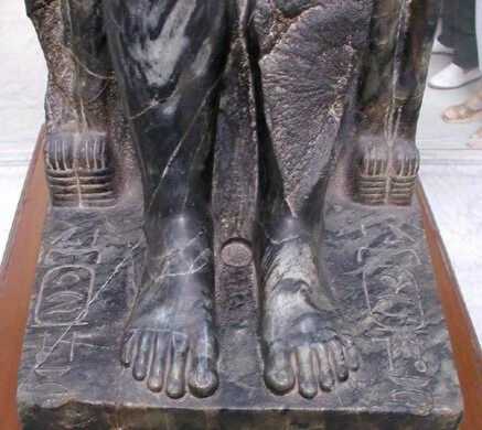 d) Sockets in granite from the Valley and Sphinx Temple of Khafre used for the ends of door-posts (4th Dynasty, image 1, image 2, image 3, Fig. 10).Fig. 9. Core hole on the diorite gneiss statue of Khafre, 4th Dynasty. (Cairo Museum, Photograph by Jon Bodsworth The Egypt Archive)