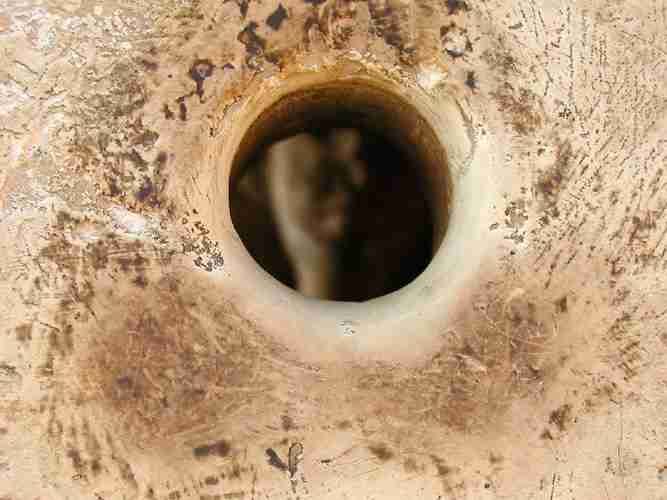 h) Marks on a granite sarcophagus with partial coring holes in a lid-peg socket (21st dynasty, image). i) Petrie gives many additional examples of core holes and cores (Petrie 1883). Drawing #7 Granite drill core found at Giza (Fig. 5.). Drawing #8 Part of a cast of a pivot hole lintel from a granite temple at Giza. In this example the core is not entirely removed, and remains to a length of 20 mm. Drawing #9 Travertine mortar (UC16038) found at Kom Ahmar, broken in course of manufacture, showing the core in place. Drawing #10 A small travertine core found with others at Memphis. Drawing #11 A marble eye for inlaying, with two core holes made with thin coring bits, one within the other. Drawing #12 Part of the side of a core hole in diorite (UC16039) exhibiting regular spaced grooves from Giza. Drawing #13 A limestone fragment (UC16041) from Giza, showing how closely holes were placed together to remove material by coring. j) Petrie (1974a) presents a number of examples. An unfinished travertine vase, exhibiting a core and core hole with parallel sided walls, in which part of the core is still attached (Fig. 12, UC33311).Fig. 11. Bolt sockets in a granite door lintel near the pyramid of Pepi II, 6th Dynasty. (core hole d. 10 cm, Photograph by Jon Bodsworth The Egypt Archive)