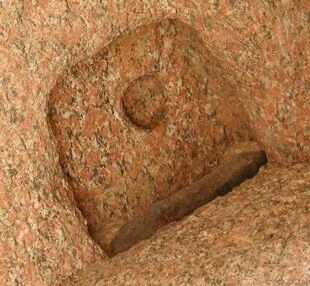 e) The travertine alter at the Sun Temple of Niuserre, near the pyramids of Abusir (5th Dynasty, image 1, image 2). f) Marks of a coring drill are found on a block from the complex of Neuserre (5th Dynasty, Borchardt 1907), with traces of verdigris from the copper coring barrel (Reisner 1931)). g) Bolt sockets for a locking mechanism in a granite door lintel near the pyramid of Pepi II (6th Dynasty, Fig. 11)Fig. 10. Granite door post socket in the Sphinx Temple, 4th Dynasty. (Photograph by Jon Bodsworth The Egypt Archive)