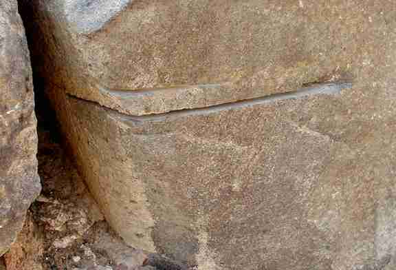 g) Saw marks on the granite sarcophagus of Hordjedef (4th Dynasty, Reisner 1931). h) Saw marks on the back of one of the greywacke triads of Menkaure (4th Dynasty, Lucas and Harris 1962, Clark & Engelbach 1930 (pl. 247)). i) Saw marks on two unfinished travertine statues of Menkaure (4th Dynasty, Reisner 1931). j) Joint faces of casing blocks of Shepseskaf's Mastabat el-Fara'un (4th Dynasty, Arnold 1991). k) Saw marks on the travertine alters in the sun temple of Niuserra (5th Dynasty, Borchardt 1905). l) Saw marks on basalt paving blocks in the mortuary temples at Niuserra (5th Dynasty, Borchardt 1905). m) Saw marks on limestone blocks from the pyramid complex of Niuserra (5th Dynasty, Borchardt 1907). n) Joint faces of casing blocks on the pyramid of Unas (5th Dynasty, Arnold 1991). o) V-shaped slots in Djedefre's rose granite sarcophagus (9th Dynasty, Stocks 2001). p) Joint faces of casing blocks on the pyramid of Senwosret I (12th Dynasty, Arnold 1991). q) Petrie (1883) gives additional examples of saw marks. Drawing #2 Fragment of hornblende diorite/granodiorite ('syenite') found at Memphis (UC16032) showing cuts on four faces. Petrie (1883) suggests this probably was made from removal of waste rock during the carving of a statue. Drawing #4 Basalt fragment (UC16034) showing saw cut of 4th Dynasty date. Drawing #6 Slab of diorite bearing equidistant parallel grooves of circular arcs which have been nearly polished out by crossed grinding. Petrie (1883) suggests the only feasible explanation of this piece is that it was produced by a circular saw. r) Basalt fragment (UC16035) sawn nearly in half from both sides, of 4th Dynasty date. s) A small unfinished statuette of quartz crystal (UC16617) demonstrates the removal of waste rock and the rough shaping of the front and sides by the use of a small lapidary saw (Petrie 1974). t) A cube-shaped fragment of limestone (UC16043), sawn on 5 faces from the 4th Dynasty. u) Colossal sandstone paw (UC29190) from a couchant figure of jackal, with saw marks on base where it was sliced for re-use, 18th Dynasty. v) A fragment of quartz or basalt (UC16040) exhibiting numerous, parallel saw cuts of unknown date.Fig. 4. Saw marks on a basalt paving stone near the east side of the Great Pyramid (approximate height 50 cm. Photograph by Jon Bodsworth The Egypt Archive)