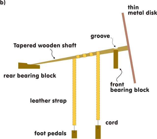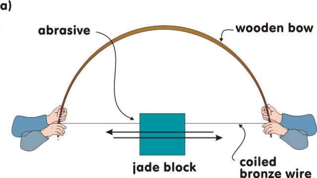 Hand powered slabbing saws used for cutting rock were also known in other ancient civilizations. The Chinese used bow-saws with coiled bronze wire blades (Fig. 6a) for working jade (Long 1976), along with other tools, such as the partial rotary mud-saw (Fig. 6b). These types of lapidary saws are believed to have first appeared in China about 1900-1600 BC (Till and Swart 1986).