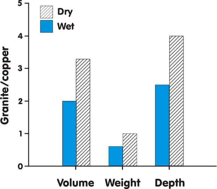The rate of rock removal is similar for both the wet and dry sand tests at about 12 cm3/hour. Stocks (2001), after comparing the ratios of volume, weight, and depth of removal between the copper saw blade and the granite block (Fig. 8), concludes that the dry test with its flat-edged blade is distinctly better than that of the wet sand test with its notched blade. This is the result of the rate of degradation of the copper saw blade being greater in the wet tests, resulting in a more costly enterprise. As well, the tailing from dry cutting can be collected and used for other purposes. Because of the inexperience of the work teams in these modern experiments, it was suggested by Stocks (2001) that the rate of cutting could be increased by a factor of 2 with increased experience.