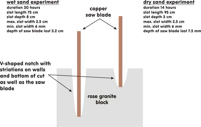 In both tests a team of 2 worker, one on either end of the saw, drew the saw back and forth across the granite surface. It was noted during both tests that the workers had some trouble keeping the saw blade perpendicular to the cut surface of the granite block. This produced a rocking of the saw blade from side to side as the blade was drawn back and forth. As a result, the slot cut in the granite exhibited a V-shaped cross-section (Fig. 6). Stocks (2001) gives for an example Djedefre's granite sarcophagus (9th Dynasty) located in the Cairo Museum, which contains two partially sawn V-shaped slots similar in appearance to that produced in the modern slabbing test.Fig. 5. Copper slabbing saw experiment using dry sand abrasive conducted by Stocks (2001).