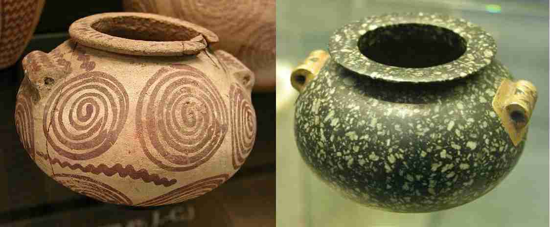 Fig. 5. a) Ceramic pot from the Nagada II period (Gerzean culture) with spiral pattern imitation of limestone breccia (height c.10 cm, Musee de Louvre, Paris. Photograph by Jon Bodsworth The Egypt Archive) b) Andesite porphyry, squat jar with gold-leafed, tubular handles from the 1st or 2nd Dynasty 3100-2686 BC. (height. c. 10 cm, British Museum (BM) Photograph by Jon Bodsworth The Egypt Archive)