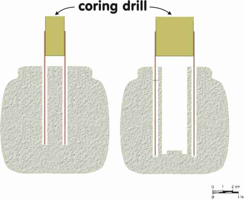 Before the introduction of the a bow- or hand-powered coring drill during the mid-Predynastic Period, holes in rocks were drilled by boring, a more time consuming practice due to the larger volume of rock that needed to be removed. The use of the coring drill as a method of removing waste rock from the vessel's intended form would have greatly increases the ancient Egyptians ability to manufacture these objects. The use of the coring drill would be dependent on the vessel's form, which are many through the long history of stone vessel production in ancient Egypt. In the case of a narrow-necked vessel (i.e. the neck opening is of smaller diameter than the vessel's interior), the coring drill is quite useful. After initial shaping of the vessel's form was completed a circle would first be marked on the top surface of the vessel and a small groove cut along it to act as a guide for the barrel of the coring drill (Fig. 14). A core hole would be cut through the center of the neck of the vessel to a depth that would allow access to the interior for the purpose of hollowing. This is similar to the methods used today by lapidist when making stone vessels (Long 1976, Can narrow-necked stone vases be made today?).Fig. 13. Representation of the ancient Egyptian coring drill used in the rock cutting experiments of Stocks (1993, 2001).