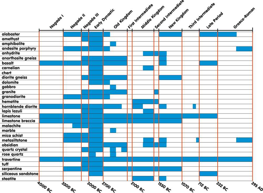 The earliest materials used were limestone, basalt, travertine, limestone breccia, and hornblende diorite during the early Predynastic period (Aston 1994). The Early Dynastic period exhibits a wide degree of experimentation with different types of stone, including vein quartz, which was the hardest material worked by the ancient Egyptians into vessels (Lucas & Harris 1962). The more exotic rocks and minerals, as well as the harder and more expensive to work material were restricted mainly to royal tombs. Although, more common and easier to work rocks like limestone, travertine, and alabaster were used for great numbers of vessels in royal tombs, they were by far the main materials used in non-royal tombs.Fig. 1. Stone vessel materials used over ancient Egyptian history (Aston 1994, Lilyquist 1995, Nicholson & Shaw 2000)