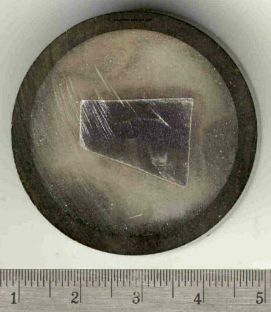 To test the ability to scratch quartz with a modern metal with a greater indentation hardness than quartz, a tungsten carbide pen scriber was used. The specimen (Fig 7a) is from the same deposit of quartz crystals (amethyst) mentioned above. The tungsten carbide scriber is seen in Figure 7b. The specimen is mounted with epoxy in a polished section casing and has been thick sectioned (top has been sawn off), so the surface is unpolished but smooth (minor saw striations). The images were scanned with a HP4100c and HP3300c flatbed scanner at 500dpi and in colour and B\W; a sheet of acetate was placed over the glass surface of the scanner for protection of the glass surface.