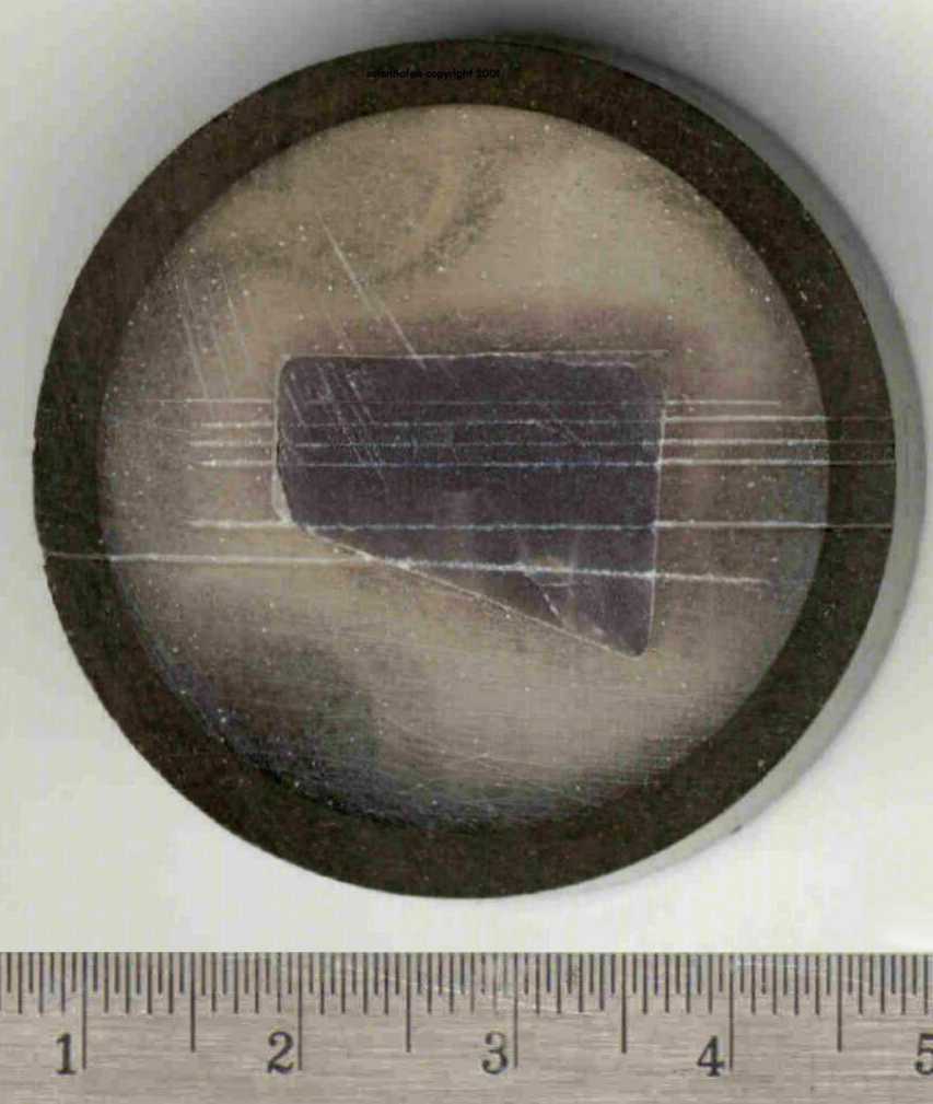 The results of this experiment can be seen in Figure 6c which clearly shows a 2 cm long groove cutting horizontally across the quartz specimen. A visual inspection was made of the surface of the quartz specimen with a 10x jewelers loupe. From this it would be estimated that the horizontal groove is about 1 mm in width with a depth of about 0.3 to 0.5 mm. The surface of the groove is smooth and polished and has a rounded shape. The edges of the groove are quite crisp and show no sign of chipping, except were the groove crosses a crystal boundary on the far right side of the specimen.