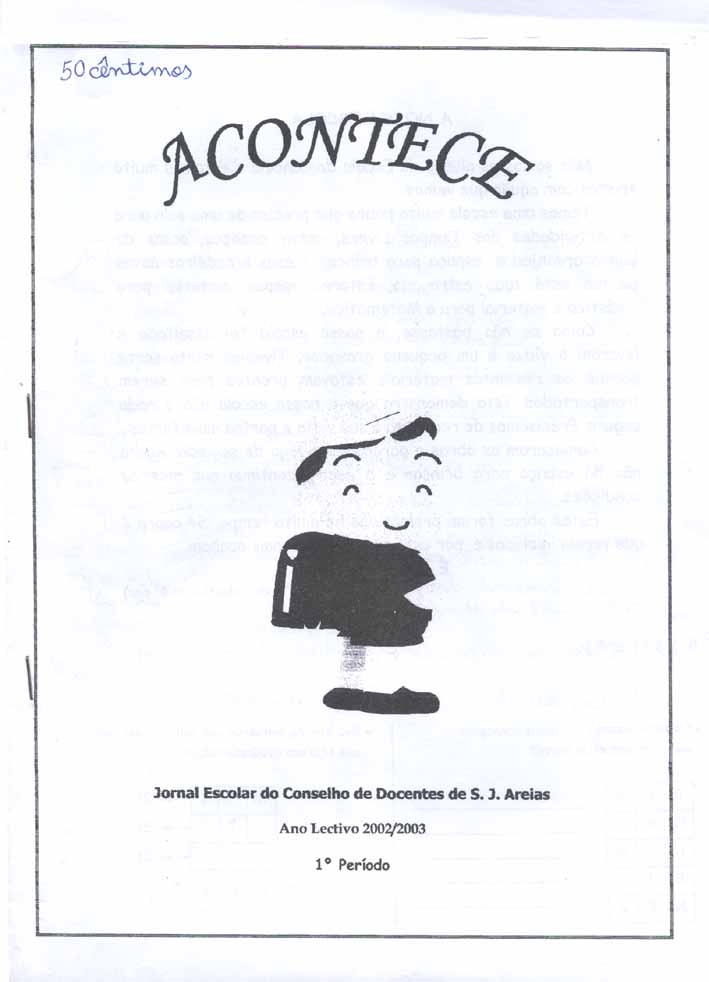 O jornal que fizemos chama-se Acontece e foi feito pelas Escolas e Jardins de Infância da freguesia de S. João de Areias (Cancela, Castelejo, S. Miguel e Povoa dos Mosqueiros). Tem desenhos, passatempos divertidos, fotografias, receitas de doces tradicionais, histórias, avisos e notícias das festas das escolas. Gravámos um CD colectivo com as escolas do pólo de Santa Comba Dão; a música que nós cantámos foi “No Alto daquela Serra”. Tivemos uma aula de Biologia onde observámos micróbios de vários tipos ao microscópio. A página da Internet fala da nossa nossa escola, de quem são os alunos, das festas da escola e também fala de algumas actividades, etc. Se quiser visitar o site escreva www.eb1-s-joao-areias.rcts.pt.