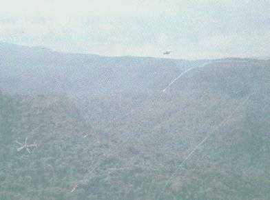 Al día siguiente, por la tarde, una escuadrilla compuesta por dos helicópteros Mi-8T, un Mi-17 y dos Mi-25 Hind D armados con cohetes de 57 mm y cañones de 23 mm, lanzaron un ataque a baja altura contra las posiciones ecuatorianas en falsa Base Sur, recibiendo como respuesta, al principio, fuego esporádico de armas ligeras. En esas circunstancias y cuando se reagrupaban para efectuar una segunda pasada, el helicóptero Mi-8T Hip E Nº 587 de la AE (al mando del Capitán EP Luis García Rojas) recibió el impacto directo de un misil -al parecer un SA-16 Igla- y se precipitó a tierra convertido en una inmensa bola de fuego. Ante la artera reacción ecuatoriana, y al ver que las estelas de más misiles se dirigían hacia ellos, los Mi-25 tendieron una cortina de chaf-flares, lo que permitió al resto de la escuadrilla regresar a su base sin ser alcanzados.