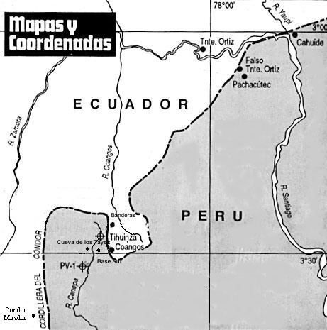 Obsérvese claramente que los puntos de infiltración ecuatoriana: "falsa Base Sur", "falsa Cueva de los Tayos", y "falsa Tiwinza" se encuentran indiscutiblemente en territorio peruano. Desde "Coangos" (ubicado en la línea misma de la frontera); "Cóndor Mirador" y "Banderas" se bombardeaba a las tropas peruanas con artillería. Las Fuerzas Peruanas tenían su base en el "PV-1" y progresaban por tierra. Desde "Coangos" y "Banderas" se enviaban refuerzos de tropas a dichos emplazamientos infiltrados en territorio del Perú. El puesto "Cóndor Mirador" además daba alerta antiaérea, ya que se encuentra a 1800 m.s.n.m. y domina toda la cuenca del río Cénepa. |
