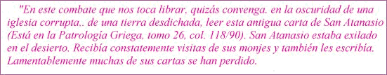 "Que Dios os consuele. He sabido que no sólo os entristece mi exilio, sino sobre todo el hecho de que los otros, es decir los arrianos. se han apoderado de los templos por la violencia y entre tanto vosotros habéis sido expulsados de esos lugares. Ellos entonces poseen los templos. Vosotros en cambio la tradición de la Fe apostólica. Ellos, consolidados en esos lugares, están en realidad al margen de la verdadera Fe, en cambio vosotros, que estáis excluidos de los templos, permanecéis dentro de esa Fe. Confrontemos pues qué cosa sea más importante, el templo o la Fe, y resultará evidente desde luego, que es más importante la verdadera Fe. Por tanto, ¿quién ha perdido más, o quién posee más, el que retiene un lugar, o el que retiene la Fe? El lugar ciertamente es bueno, supuesto que a11í se predique la Fe de los Apóstoles, es santo, si allí habita el Santo. (¿No es para hoy esta carta?}. Vosotros sois los dichosos que por la Fe permanecéis dentro de la Iglesia, descansáis en los fundamentos de la Fe, y gozáis de la totalidad de la Fe, que permanece inconfusa. Por tradición apostólica ha llegado hasta vosotros, y muy frecuentemente un odio nefasto ha querido desplazarla, pero no ha podido; al contrario, esos mismos contenidos de la Fe que ellos han querido desplazar, los han destruido a ellos. Es esto en efecto lo que significa afirmar: "TU ERES EL HIJO DE DIOS VIVO". Por tanto, nadie prevalecerá jamás contra vuestra Fe, mis queridos hermanos, y si en algún momento Dios os devolviere los templos, será menester el mismo convencimiento: que la Fe es más importante que los templos. Y precisamente una Fe tan viva suple para vosotros, por ahora, la devolución de los templos. No es que yo hable sin respaldo de la Escritura, por e1 contrario, os digo con énfasis que os conviene confrontar sus testimonios. Recordad precisamente que el templo era Jerusalén, y que el templo no estaba en el desierto cuando los enemigos lo invadieron. Los invasores venidos de Babilonia habían irrumpido como juicio de Dios, que probaba o que corregía y que, precisamente por medio de estos enemigos ávidos de sangre imponía castigo a los que lo ignoraban. Los extranjeros, pues, se posesionaron del lugar, pero éstos, en el lugar, negaban a Dios. Justamente porque no sólo no tenían respuestas adecuadas, ni las proferían, sino que estaban excluidos de la verdad. Por tanto ahora también, ¿de qué les sirve tener los templos? Si efectivamente, los tienen, pero eso a los ojos de quienes se mantienen fieles a Dios indica que son culpables, porque han hecho cueva de ladrones y casas de negocios, o sitios de disputas vanas lo que antes era un lugar santo, de modo que ahora les pertenece a quienes antes no les era lícito entrar. Muy queridos, por haberlo oído de quienes han llegado hasta aquí, sé todo esto y muchas otras cosas peores; pero, repito, cuanto mayor es el empeño de éstos por dominar la Iglesia, tanto más están fuera de ella. Creen estar dentro de la verdad, aunque en realidad están excluidos de ella, prisioneros de otra cosa, mientras la Iglesia, desolada, sufre la devastación de estos supuestos benefactores". Hasta aquí La carta de San Atanasio, del año 356 exactamente. |