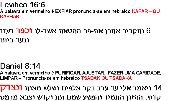 Na Bíblia hebraica: traduzida diretamente do hebraico para o português temos em Levítico Expiar e em Daniel 8:14 temos "só então vencerá o que é sagrado" - ( para quem não conhece essa Bíblia , ela está a venda em www.sefer.com.br )