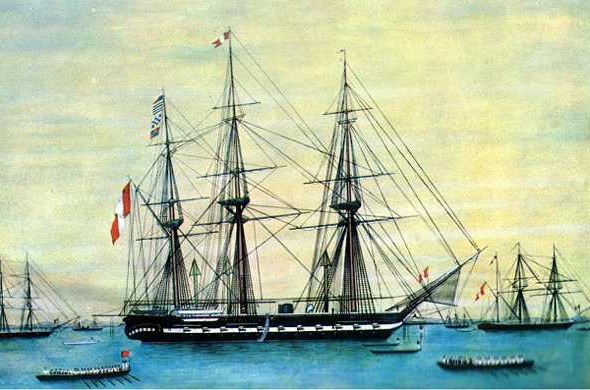 Above, the frigate Callao, one of the most powerful ships of the Peruvian fleet during the decade of the 1850's. She was armed with 44 guns, was propelled by a 300 HP engine and had a weight of 1,666 tons. Was the flagship of President Castilla during the blockade of the Ecuadorian port of Guayaquil. In the painting she can be seen surrounded by other warships of the squadron at the port of Callao.