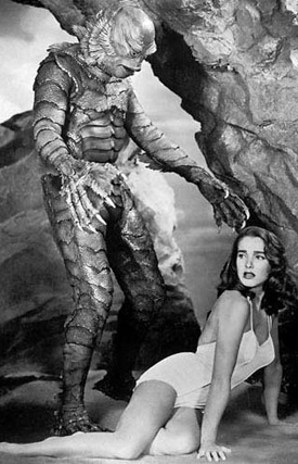 In this classic '50's monster movie about an expedition up the Amazon that encountersa vicious half man, half fish "Gill Man", the creature is captured but escapes. Taking a liking to heroine Adams, he carries her off to his misty cave. The film is full of powerful scares and steamy eroticism - the famous swimming scene was obviously an inspiration for the opening sequence in Jaws. Originally released in 3-D, this films's great success led to the sequels Revenge of the Creature and The Creature Walks Among Us and an entire lot of monster from the deep B movies.