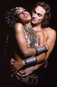 "Queen of the Damned," based on Anne Rice's Vampire Chronicles, stars Stuart Townsend as Lestat, in the role played last time by Tom Cruise. The world got to be too much for him, Lestat explains, and so he withdrew from it and went to sleep 200 years ago. But then "the world didn't sound like the place I had left--but something different, better." Cut to a montage of musical groups, and Lestat pushes back the stone lid of his crypt and materializes during a rehearsal of a rock band. When they ask who he is, he smiles and casts centuries of tradition to the winds: "I am ... the Vampire Lestat!" Soon he's a rock god, the lead singer of a goth band. Other characters emerge. We meet Jesse (Marguerite Moreau), researcher for a London vampire study institute. She likes to play with danger, and even cruises a vampire bar Lestat told her about. We meet the fey Marius (Vincent Perez), the older vampire who turned Lestat on, or out. And Maharet (Lena Olin), who is supposed to be a good vampire, or at least one who wishes the others would follow the rules. Along the way we are given vampire feeding lessons: "You must never take the last drop, or it will draw you in, and you die." Most noticeably we meet Queen Akasha, she appears first as a statue in a phantasmagorical Egyptian crypt-like shrine, where Lestat plays his violin so fiercely that parts of her stone body seem to glow back into life. She "drank the world dry when she ruled Egypt," Marius tells Lestat. Soon Akasha is alive all over, and is making plans about she and Lestat will rule the world.