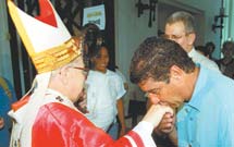 Treinador do Flamengo toma bênção do Cardeal Arcebispo do Rio de Janeiro , Dom Eusébio Oscar Scheidt , durante missa na Igreja de São Judas Tadeu. São Judas Tadeu é padroeiro do clube de futebol do Rio de Janeiro.