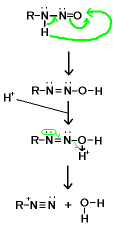第三段階でニトロソアミンで、水素が窒素から酸素に移動する。水素は、H+の形で、酸素の非共有電子対に配位結合する。
