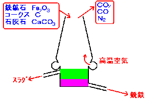 主成分はCaSiO3、Al2(SiO3)3で、銑鉄より軽いため、銑鉄のうえに浮かぶように溜まる。 スラグは建築材料として用いられるが、もっと重要な意味がある。 溶鉱炉中は高温なので、FeはO2と触れると、すぐ酸化してしまう。 しかし底に溜まる銑鉄の上を、スラグが覆っているので、銑鉄が吹き込まれる熱風にさらされる事が無く、酸化する事もありません。これがもう一つの、スラグの役目です。