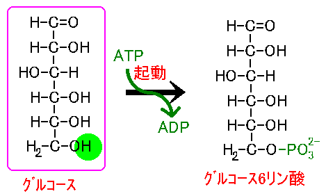 ATP一分子によって、グルコースの6番炭素にリン酸が付加します。