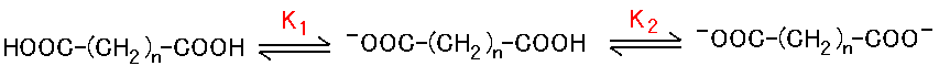 理由は、第一電離によって生じたモノカルボキシラートイオン -OCC-(CH2)n-COOH の負電荷が、残っているカルボキシル基によて安定化されるため、ジカルボン酸のモノカルボキシラートイオンは、モノカルボン酸のカルボキシラートイオンよりも安定だからである。