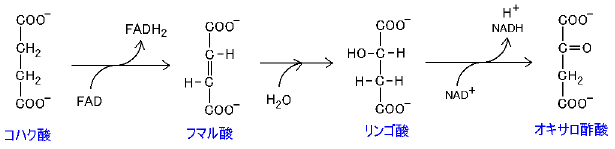 最初の コハク酸 → フマル酸 の段階は、エネルギー的にNAD+(= 3 ATP)の還元を行なうには十分でなく、そのためFAD(= 2 ATP)を用いる。