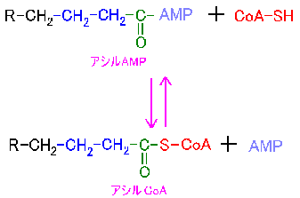 次の段階として、CoAがアシルAMPを攻撃し、アシルCoA を生じる。