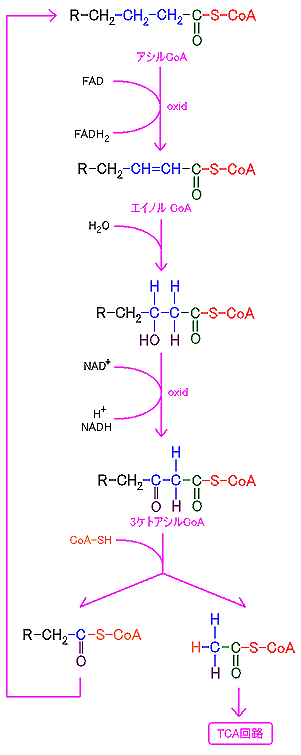 一方で、最初に比べ二分子短くなったアシルCoAが生じるので、これをサイクル反応させる訳だね。