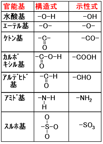 また同時に、官能基自身も、全構造を描かなくても、「水酸基だ」とか「カルボキシル基だ」とかが分かれば、(構造は分かりきっているから)細かく書く必要はありませんね。そこで表のように略して書きます。