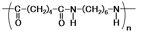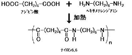 原料は HOOC-(CH2)4-COOH アジピン酸 と、 H2N-(CH2)6-NH2 ヘキサメチレンジアミン で、アミド結合によって縮重合します。