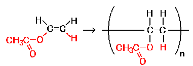 こうして生じた酢酸ビニルは、ビニルアルコールとは違って、不安定ではないので、問題ありません。これを付加重合して、ポリ酢酸ビニルを合成します。