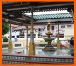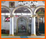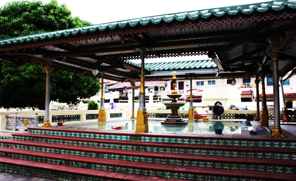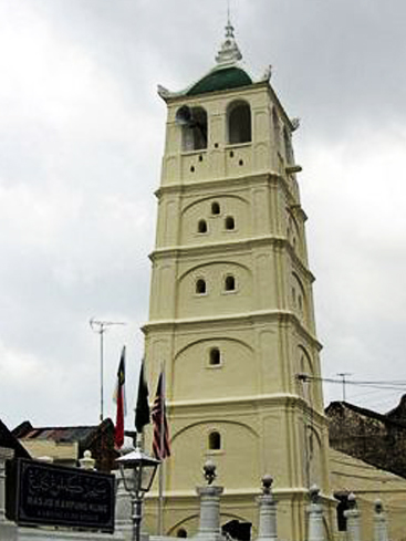 The original structure built by Indian Muslim traders in 1748 was a wooden building and in 1872, it was rebuilt in brick. The mosque is one of the traditional mosques in Melaka, which still retains its original design. The architectural design of the mosque is a cross between Sumatran, Chinese, Hindu, and the Melaka Malay. The minaret, ablution pool and entrance arch were built at the same time with the main building. The minaret resembles a pagoda. The mosque also has a blend of English and Portuguese glazed tiles, Corinthian columns with symmetrical arches in the main prayer hall, a Victorian chandelier, a wooden pulpit with Hindu and Chinese-style carvings, and Moorish cast iron lamp-posts in the place of ablution for pre-prayer cleansing.