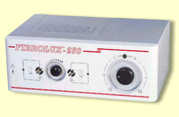 OPTOMIC COLD LIGHT SOURCE 250w WITH DOUBLE HALOGEN LAMP FIBROLUX-250 *Light of high intensity. *Maximum brightness. *Double light outlets. Double halogen lamp 250w of quick connection controlled by an only main switch. *Lamp pre-heater. *Illumination intensity regulated by mechanical diaphragm, keeping constant colour temperature (ºK). *Halogen lamp 250w XENONPHOT HLX. *Double refrigeration system with two silent independent fans. *Excellent refrigeration of fiber optics connectors. *Protected from electrical peaks and overheating. *Easy lamp replacement. *Very strong unit of simple operation.