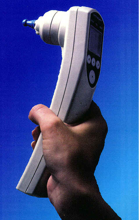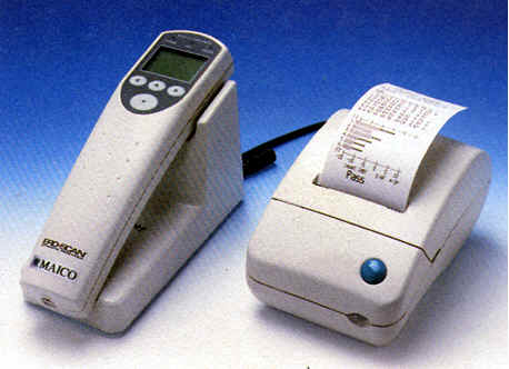 MAICO 耳音傳射速測槍 EroScan DPOAE * 6V電池式手持操作, LCD液晶顯示測值 * 300g 超輕機身(含4枚AA電池) * 低噪音防震探頭自動偵測, 耳道密合自動起測, 如阻塞或漏氣, 則拒斥待測並警告顯示 * 可外接耳機, 全程監聽音頻 * 矽質耳塞, 阻絕噪音佳, 可重覆使用 * 自訂分析範圍(1.5 ~ 6 KHz): 頻率模式: 1.5 ~ 6 KHz(A)、2 ~ 6 KHz(B)、2 ~ 4 KHz(C/Basic)頻率解析 : 3 頻、6 頻音量 : -15 ∼ 10 dB SPL* f1/f2 刺激音: 40 ∼65 dB SPL (1dB step) * Sampling Rate刺激取樣率: 31,250 Hz * 自動判定Pass/Fail (自訂S/N值: 0 ∼ 10 dB SPL) * 充電式DC(13V)熱感印表機(630g): *列印模式: All (50耳), 或Last (2耳/一筆) * 標準配備:Eartip耳塞組, 熱感紙(1)、校正測試座(1)、雙頻監聽耳機(1)、操作手冊(1) * 選擇配備 : PC download via RS232 電腦連接儲存或分析