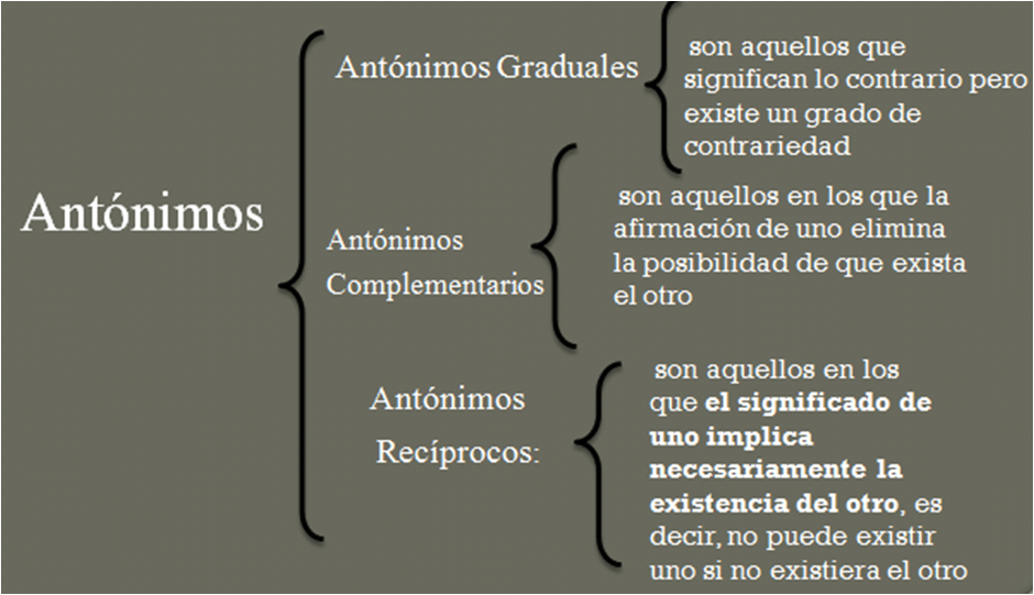 AntónimosLos antónimos son lo opuesto a los sinónimos, son palabras que significa lo contrario u opuesto. La palabra antónimo proviene del idioma griego antónimos que se traduce en (antónimos) y deriva de anti (contrario), y noma (nombre), quedando la traducción de: “contrario al nombre”. Existen 3 clases de antónimos, las clases son: |