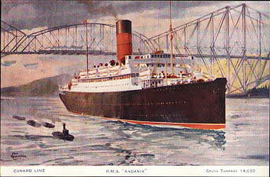 | The Andania was launched on November 1, 1921 and completed on May 24, 1922. She made her maiden voyage on June 1, 1922 from Southampton to Montreal. In 1925 she was placed on the Hamburg to New York service. In 1927 she changed to the Liverpool-Glasgow-Belfast-Quebec-Montreal service in conjunction with Anchor-Donaldson Line sailings. She was fitted out as an armed merchant cruiser in September 1939. On June 16, 1940 the Andania was torpedoed and sunk by the German submarine U-A 70 nautical miles from Reykjavik. (The date of sinking given in British sources, June 15, is correct according to British time. In German time the attack occurred on the 16th at 00.27 hours) | ||||||||||||||||||||||||||||||||||||||||||||