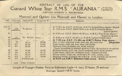 | RMS Aurania (III) -- Abstract of Log Card -- Montreal & Quebec to London -- July 21 thru 29, 1939 | |||||||||||||||||||||||||||||||||||||||||||||||||
