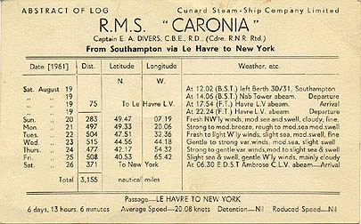 | RMS Caronia (II) -- Abstract of Log Card -- Southampton to New York -- August 19, 1961 thru August 26, 1961 | ||||||||||||||||||||||||||||||||||