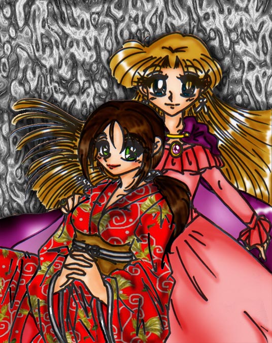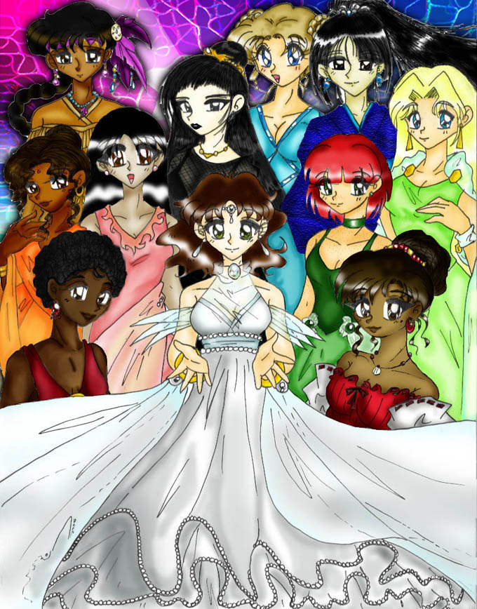| The court of Jewels----> from left to right; Top row: Amethyst (American Indian), Aquamarine (Dutch) Sapphire (Japanese). 2nd row: Topaz (Indian), Rose Quartz (Italian), Onyx (Canadian), Emerald (American), Peridot (German). Bottom row: Ruby (African), Diamond-Opal (British), and Garnet (Peruvian). |