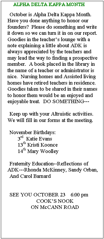 My sincerest apologies to Rhonda, Carol B., and Sandy for forgetting to let you share your reflections of Alpha Delta Kappa.  You may do so at our November meeting, or e-mail them to me and I will email to all. This month’s reflection of Alpha Delta Kappa will be by Mitzi Horton, Sharon Jennings, and Kristi Koonce.