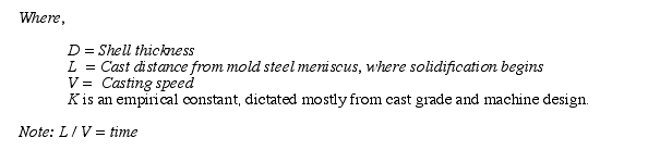 MoldThe main function of the mold is to establish a solid shell sufficient in strength to contain its liquid core upon entry into the secondary spray cooling zone. Key product elements are shape, shell thickness, uniform shell temperature distribution, defect-free internal and surface quality with minimal porosity, and few non-metallic inclusions. The mold is basically an open-ended box structure, containing a water-cooled inner lining fabricated from a high purity copper alloy. Mold water transfers heat from the solidifying shell. The working surface of the copper face is often plated with chromium or nickel to provide a harder working surface, and to avoid copper pickup on the surface of the cast strand, which can facilitate surface cracks on the product. Mold heat transfer is both critical and complex. Mathematical and computer modeling are typically utilized in developing a greater understanding of mold thermal conditions, and to aid in proper design and operating practices. Heat transfer is generally considered as a series of thermal resistances as follows: