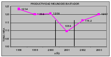 4.3.-El cambio de ruta de proceso represento disminuir la productividad del Molino Desbastador en las etapas de implantación y aprendizaje; el grafico muestra que la productividad con el proceso tradicional (lingote) era de 120 Ton/hr., disminuyendo a 110 Ton/hr. Actualmente se ha logrado el estándar que se tenía antes del cambio de proceso (planchón).