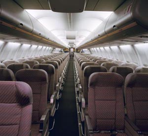 The new interior offers passengers a spacious, user-friendly cabin with comfortable, aesthetically pleasing surroundings and gives operators a cabin that is both durable and flexible. The interior features new soft, indirect lighting that enhances cabin ambience along with a smooth sculptured ceiling, giving the cabin a more open, spacious feel. The curved ceiling panels offer up to three additional inches of headroom. Longer overhead stowage bins give passengers more storage space. The additional space was created by advanced engineering on the bins that eliminated the need for an internal support brace. A handrail that extends along the bottom of the stowbins and a moveable cabin class divider also is available |