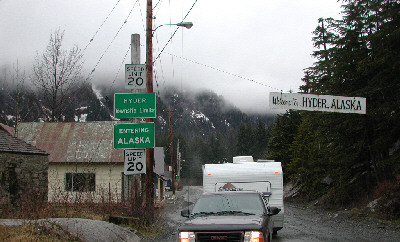 We had hoped to take a ferry over to Alaska, but the ferry schedule made that impossible for us. So, we decided to drive up to Hyder, Alaska* (picture at the top of page) after leaving Prince Rupert, crossing the border at Stewart, BC. We were the only tourists in town, and stayed overnight at a US Forest pullover at the north end of town. We didn't stay long enough to meet anyone except the guy at the "Border Bandit" where we bought some postcards.