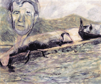 «In this painting I represent my surname Manterola. My grandfather died when I was four, and the only references I have of him are from some photographs. Going back in time I only managed to get as far back as my great-grandfather, who harpooned the last whales caught in Orio, according to some verses sung by Benito Lertxundi. This is what I wanted to create: my great-grandfather with the whale and my grandfather in a closer plane. And I did it using muted colors, almost in black and white, because it's not a living memory or something I have close to hand.»