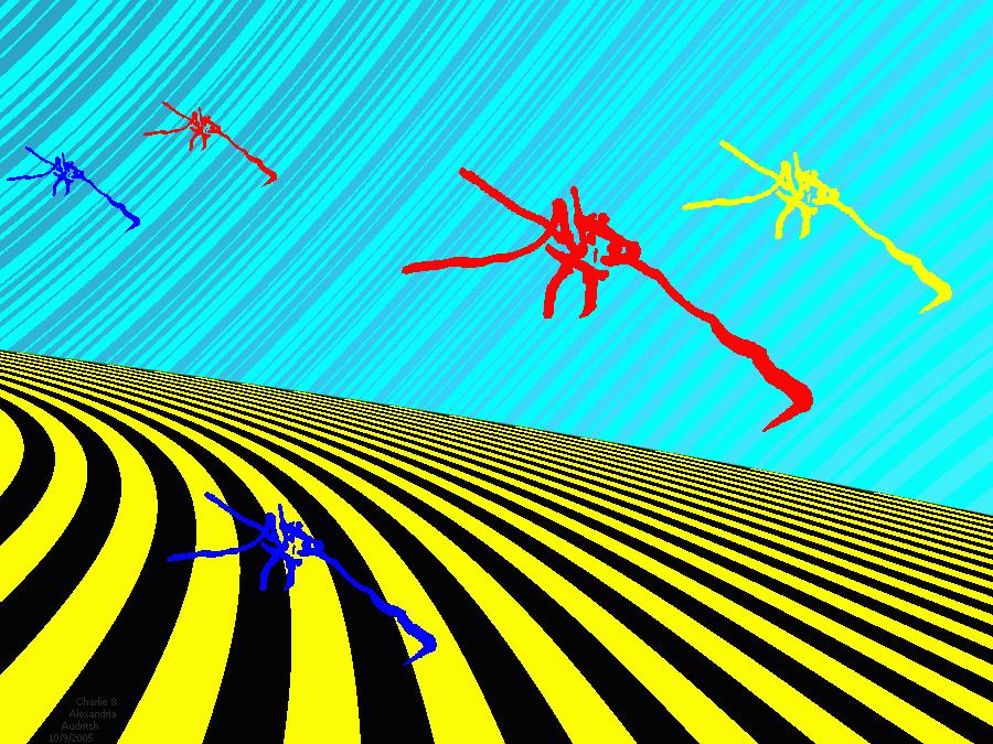 She drew the vaguely Sponge Bob looking doodle on the back of a bank deposit ticket, blue highlighter on blue paper 2.5"x6", whilst mom conducted banking business. I scanned said doodle, cleaned it up, came up with one of my wild backgrounds (this time using POV-Ray), and a few pastes and some coloring later, viola!