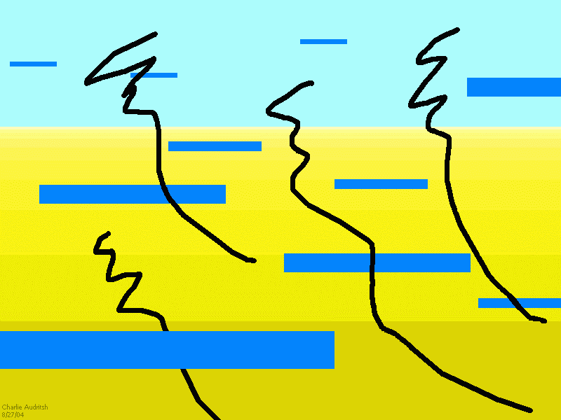 Tonight I ran some more with the ideas of the black squiggles and the long rectangles. This one took a lot longer than 20 minutes. More like an hour plus. I actually used a spreadsheet to do this one, if you can believe that. I used a range of cells with the formula =A3-((A3-175)/3) to calculate the diminishing thickness of the 10 bands of yellow, so as to make a gradation. Each band is 10 points more luminous than the one below. Yeah, computer art can easily become a "whole brain" activity.