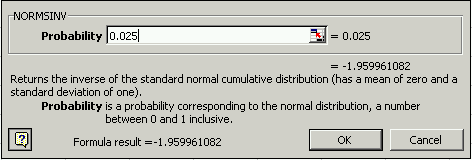 โดยโปรแกรม Minitab ได้ดังนี้ Inverse Cumulative Distribution Function Normal with mean = 0 and standard deviation = 1.00000 P( X <= x ) x 0.0250 -1.9600